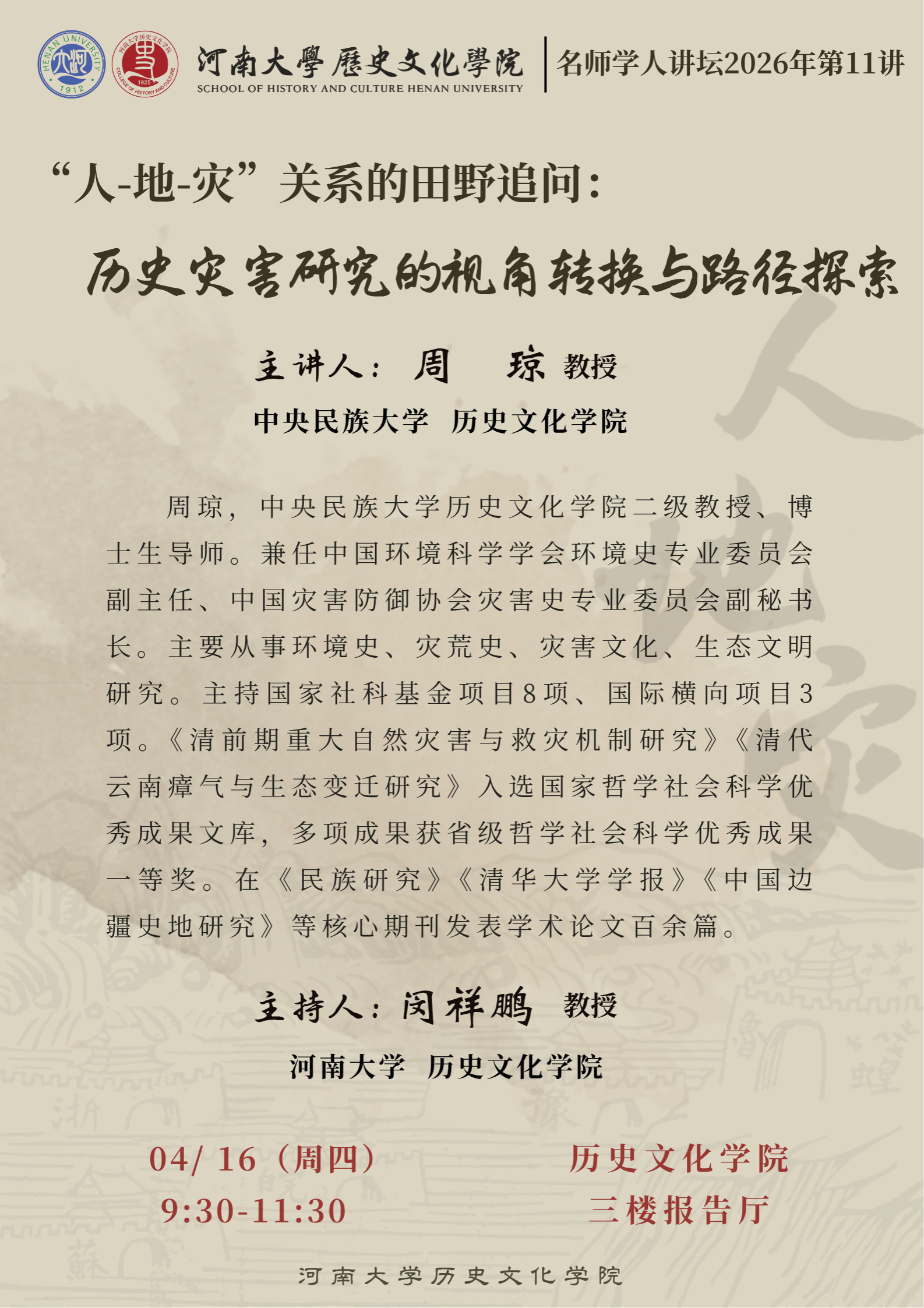 【讲座预告】“人-地-灾”关系的田野追问: 历史灾害研究的视角转换与路径探索