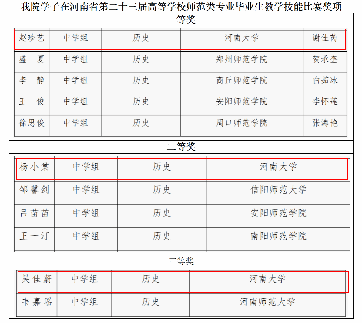 2025年11月12日,河南省教育厅发布了第二十三届高等学校师范类专业毕业生教学技能比赛结果。颜射入口2022级赵珍艺同学荣获中学历史组一等奖第一名,杨小棠同学荣获二等奖、吴佳蔚同学荣获三等奖,谢佳芮老师获优秀指导教师称号。