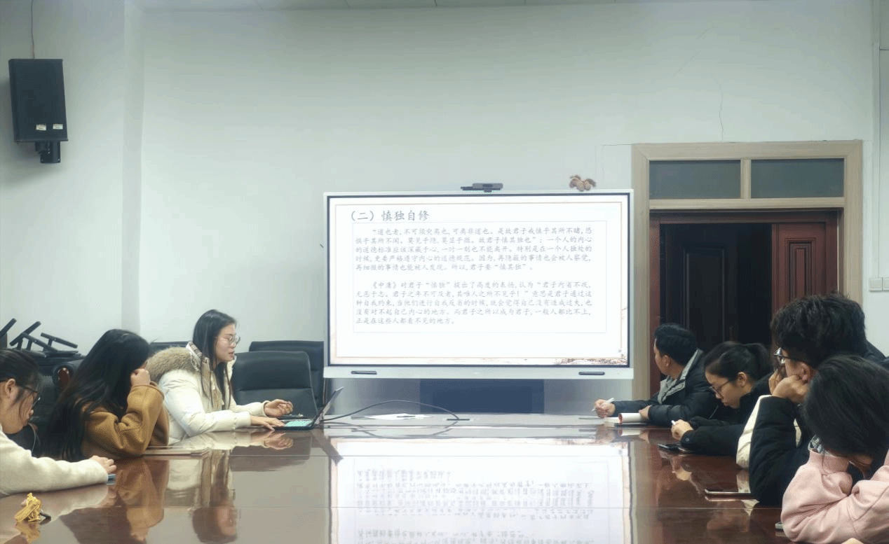 2025级党员李怡茹作为主讲人以儒家经典《中庸》为研读文本,围绕书中“中和”“至诚”“慎独”等核心思想,结合历史语境与当代意义展开深入解读。她表示,《中庸》强调“喜怒哀乐之未发谓之中,发而皆中节谓之和”,是情感与行为的适度与和谐,并非固守折中,而是倡导灵活因时制宜的处世智慧。我们借鉴“中庸之道”有助于培养理性平和、求同存异的社会心态,推动构建和谐社会。习近平总书记曾在《之江新语》中引用《中庸》“君子慎其独也”,强调党员干部必须加强自我约束、保持廉洁自律。这一理念不仅适用于党性锤炼,更为青年党员提升自身品德修养提供了思想指引。它倡导大家始终做到言行一致、表里如一,从而筑牢社会诚信的基石。